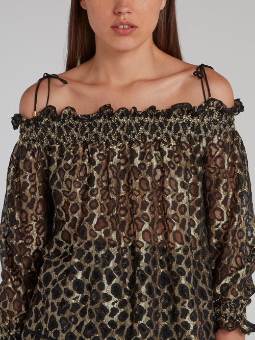 Unleash your wild side with the Just Cavalli Gold Off-The-Shoulder Leopard Mesh Top! This stunning piece boasts a tantalizing off-shoulder neckline and a daring leopard mesh fabric, exuding an exotic and edgy vibe. The gold accents add a touch of glamour to the top, making it the ultimate statement piece for any fierce fashionista.