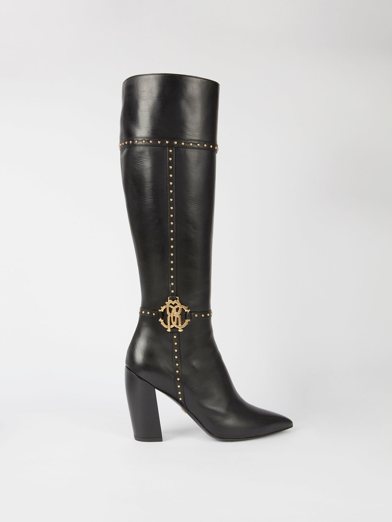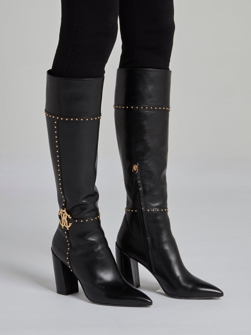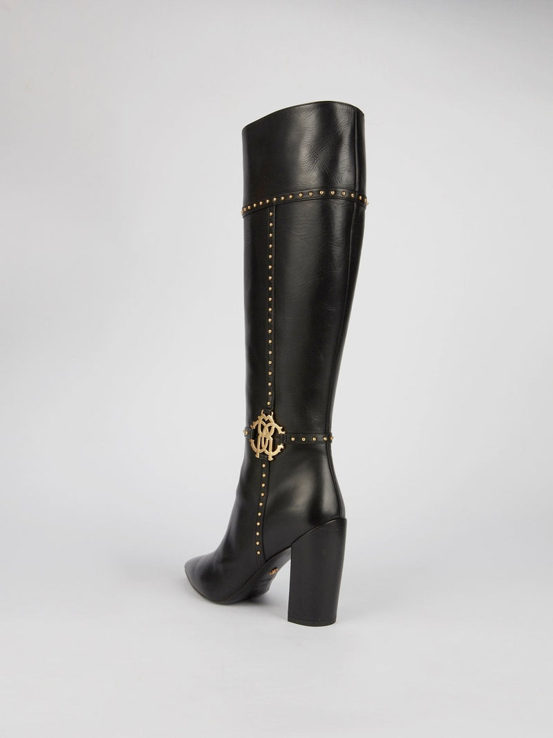 Step up your fashion game with these stunning Black Leather Knee High Boots by Roberto Cavalli. Made from premium quality leather, these boots are durable, comfortable, and designed to last for years. The sleek, chic, and stylish design featuring a pointed toe and high block heel ensures that you'll look stunning while adding an alluring edge to your outfit.